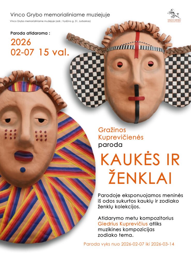 Vinco Grybo memorialiniame muziejuje dokumentų salės sienos žaismingai pasipuošė gausybe meniškų kaukių, kurias sukūrė kaunietė menininkė Gražina Kuprevičienė. Tačiau ne vien kaukes, bet ir zodiako ženklus, bei odinius reljefus, o ir skulptūrėles bus galima išvysti parodos ekspozicijoje, kurios atidarymas vasario 7 d., 15.00 val.